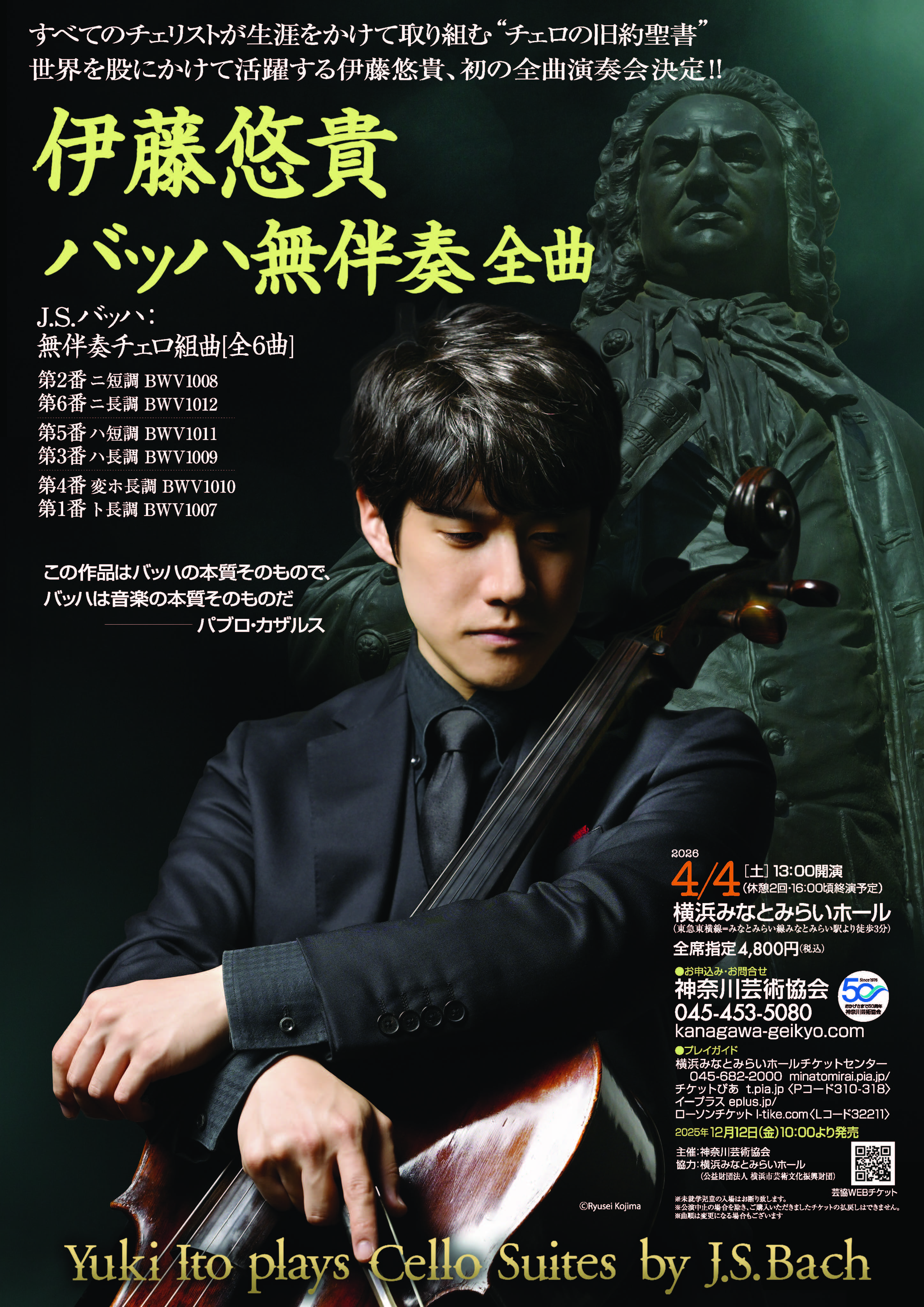 【日時】令和8年4月4日(土)13:00開演 【場所】横浜みなとみらいホール 【募集人数】全席指定10席 【会員負担額】大人3,300円 (一般価格 大人4,800円) 【申込先】伊藤悠貴バッハ無伴奏全曲 【チケット代金の入金方法】神奈川芸術協会から送付される振込用紙で直接納付 【チケット送付方法】チケットはご自宅へ郵送となります。 送料(1件480円)は各自ご負担ください。 【申込締切日】令和8年3月22日(日) 23:59 |