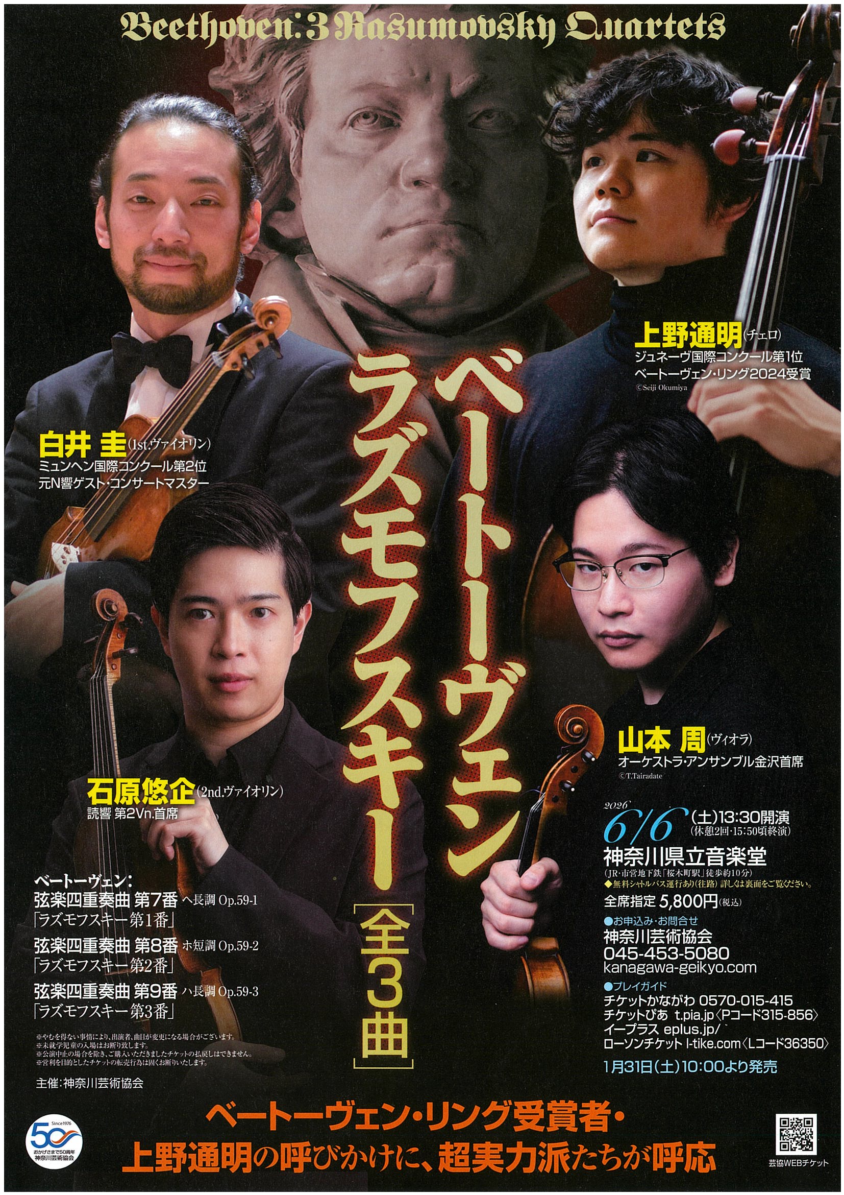 | ベートーヴェン ラズモフスキー【全3曲】 | 【日時】令和8年6月6日(土)13:30開演 【場所】神奈川県立音楽堂 【募集人数】全席指定10席 【会員負担額】4,100円(一般価格5,800円) 【申込先】ベートーヴェンラズモフスキー全3曲 【チケット代金の入金方法】神奈川芸術協会から送付される振込用紙で直接納付 【チケット送付方法】チケットはご自宅へ郵送となります。 送料(1件480円)は各自ご負担ください。 【申込締切日】令和8年3月31日(火) 23:59 |