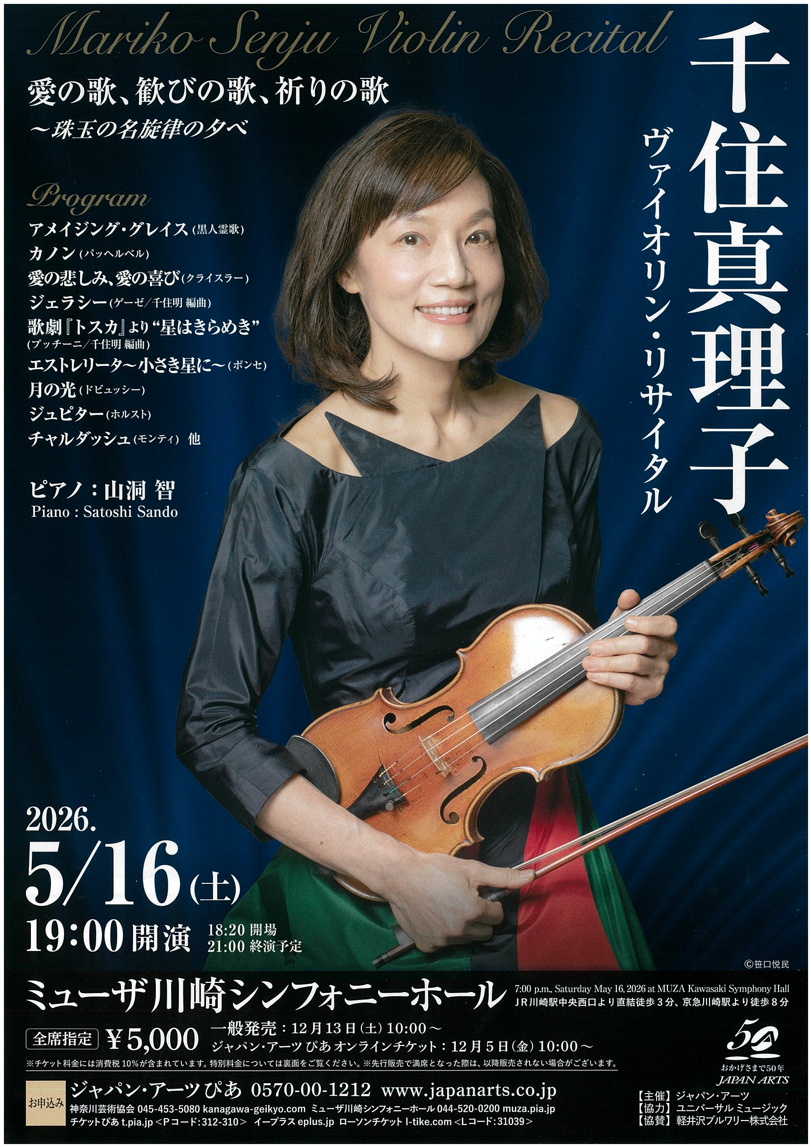 | 千住真理子 ヴァイオリン・リサイタル | 【日時】令和8年5月16日(土)19:00開演 【場所】ミューザ川崎シンフォニーホール 【募集人数】全席指定10席 【会員負担額】3,500円(一般価格5,000円) 【申込先】千住真理子ヴァイオリンリサイタル 【チケット代金の入金方法】神奈川芸術協会から送付される振込用紙で直接納付 【チケット送付方法】チケットはご自宅へ郵送となります。 送料(1件480円)は各自ご負担ください。 【申込締切日】令和8年3月31日(火) 23:59 |