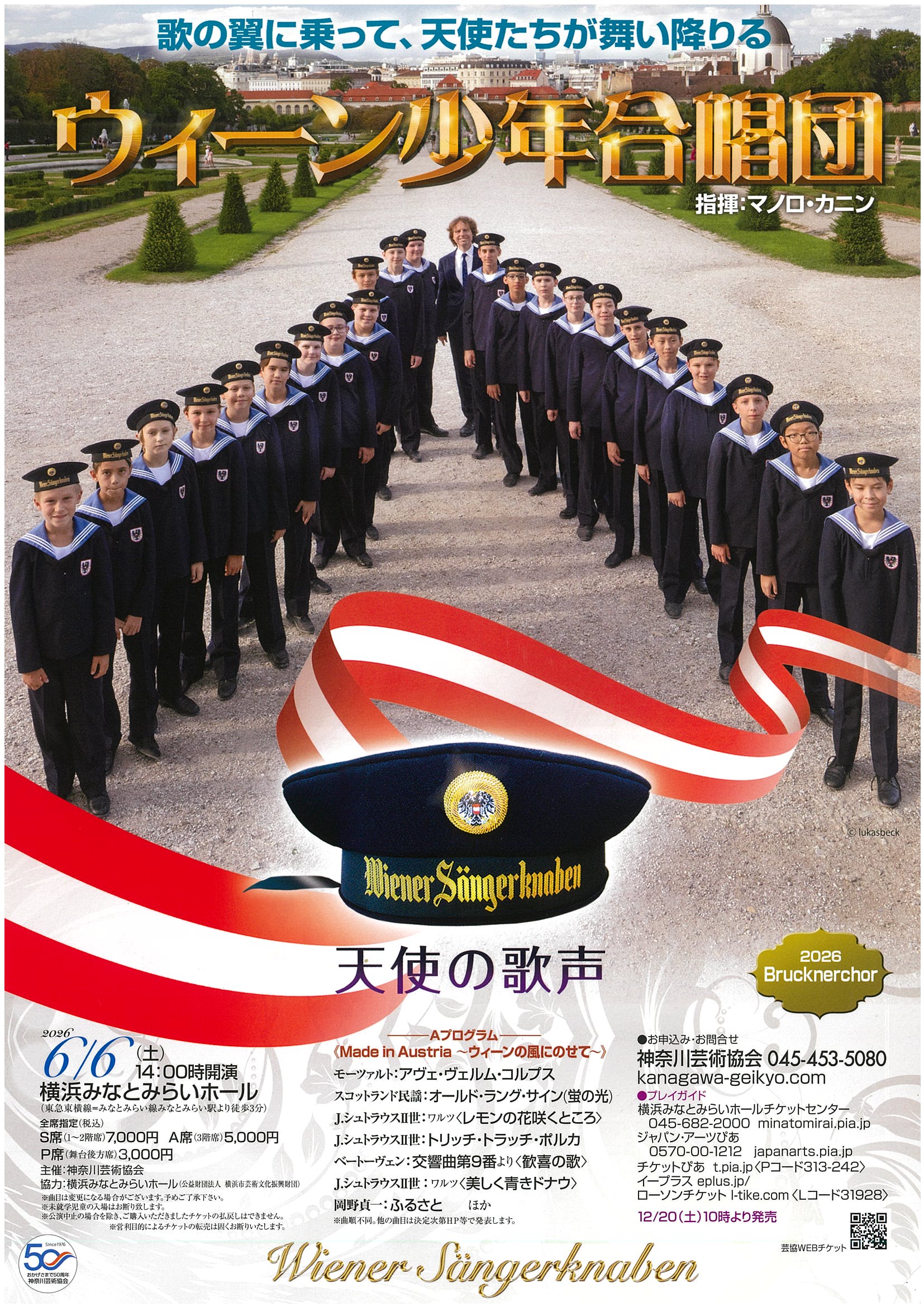 | 【日時】令和8年6月6日(土)14:00開演 【場所】横浜みなとみらいホール 【募集人数】S席 10席 【会員負担額】4,900円(一般価格7,000円) 【申込先】ウィーン少年合唱団 【チケット代金の入金方法】神奈川芸術協会から送付される振込用紙で直接納付 【チケット送付方法】チケットはご自宅へ郵送となります。 送料(1件480円)は各自ご負担ください。 【申込締切日】令和8年3月31日(火) 23:59 |