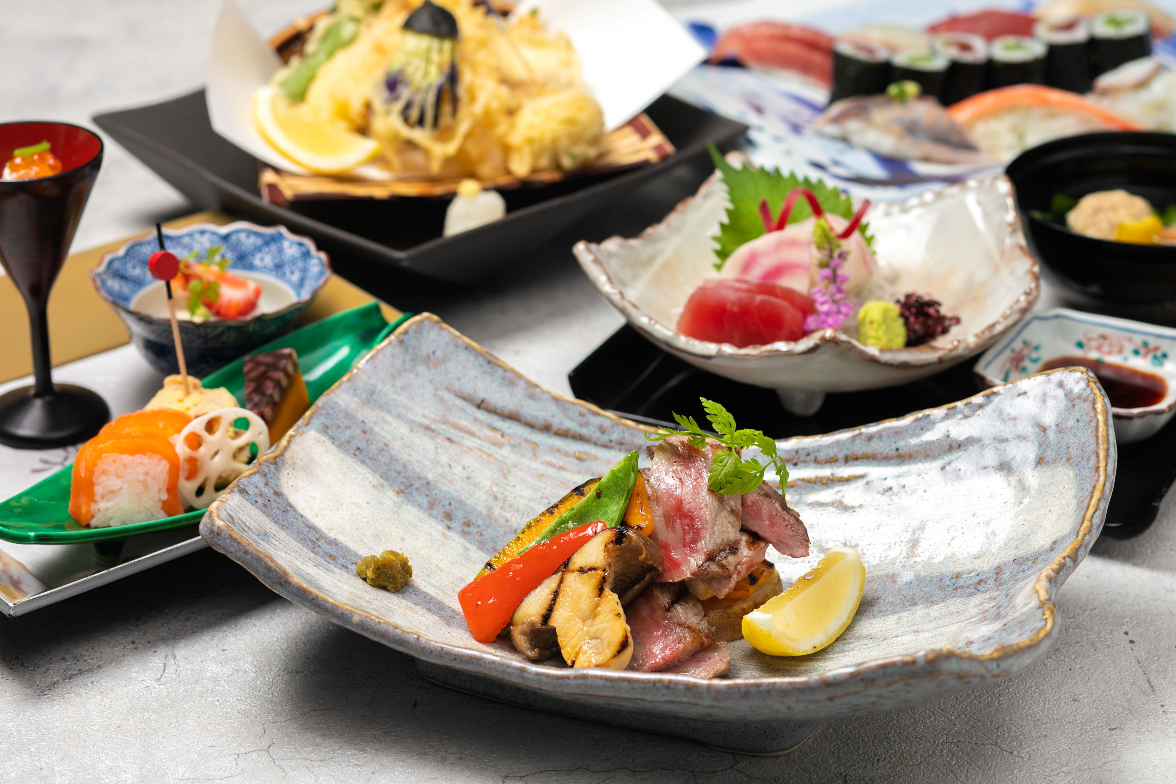 (通常「楽」会席 ¥12,430、炙り米沢牛握り(二貫) ¥1,356 消費税・サービス料13%込み)